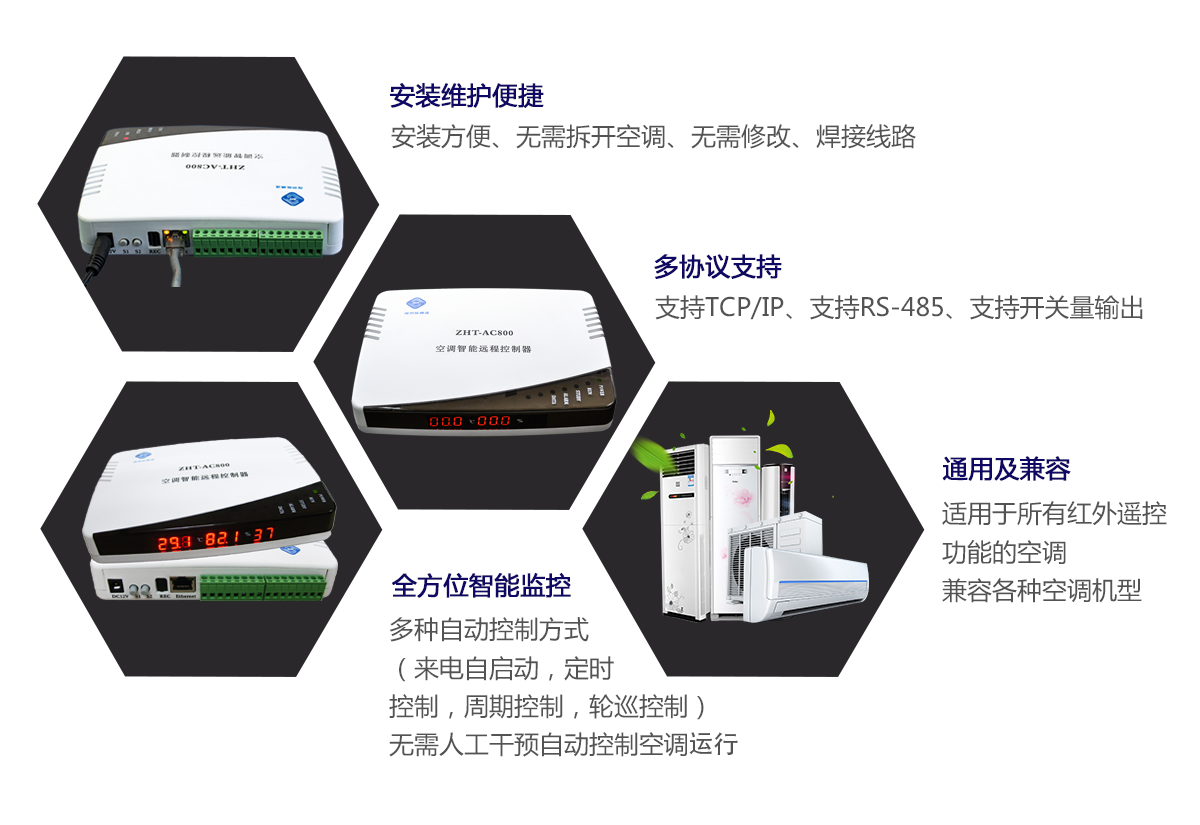 ZHT-AC800 網(wǎng)絡(luò)型空調(diào)智能啟動(dòng)控制器,利用 PC 機(jī)控制軟件,通過(guò)網(wǎng)絡(luò)或 RS485 與設(shè)備進(jìn)行通訊,可實(shí)現(xiàn)上百臺(tái)空調(diào)的集中聯(lián)網(wǎng)控制。通過(guò)學(xué)習(xí)空調(diào)遙控器的空調(diào)的開(kāi)啟和關(guān)閉、工作模式、溫度調(diào)整等紅外信號(hào),實(shí)現(xiàn)空 調(diào)斷電再來(lái)電自動(dòng)啟動(dòng),并開(kāi)啟到用戶(hù)需要的運(yùn)行模式,同時(shí)具備溫度檢測(cè)控制功能,按用 戶(hù)配置的溫度值,當(dāng)環(huán)境溫度達(dá)到設(shè)定值后,自動(dòng)開(kāi)啟和關(guān)閉空調(diào),兼容市面上各種品牌柜式機(jī)、分體壁掛機(jī)、吸頂式機(jī)等各 種空調(diào)機(jī)機(jī)型。