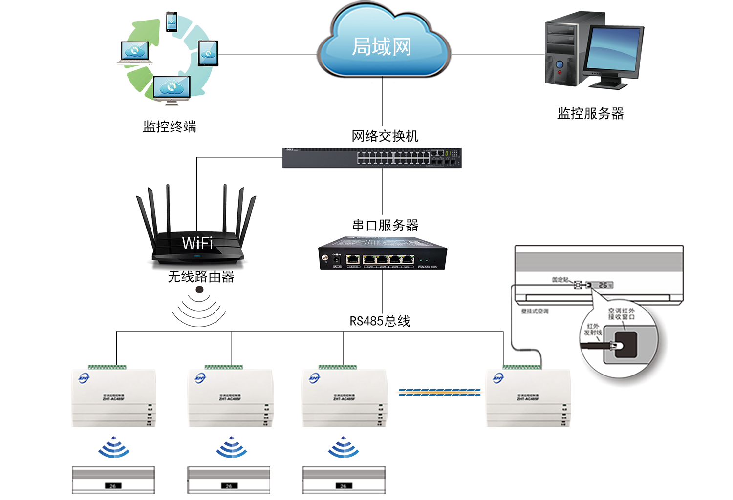 ZHT-AC485F空調(diào)遠程控制器內(nèi)置WiFi通訊模塊和RS485通信接口,可直接使用WiFi連接進行空調(diào)控制器的參數(shù)配置及數(shù)據(jù)采集,同時對于有線連接便捷的場景,也可直接使用485總線連接,實現(xiàn)空調(diào)的遠程集中控制、安裝維護簡單方便,其系統(tǒng)組網(wǎng)圖如左側(cè)所示。