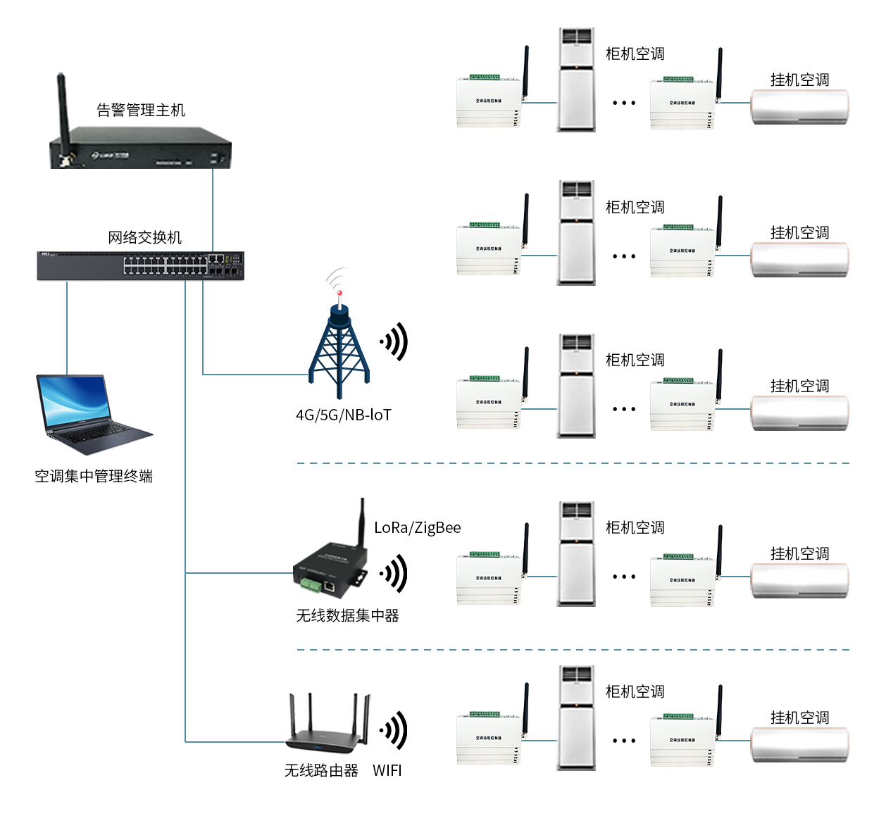 AC485F-WL系列無線空調(diào)遠程控制器可選配多種無線通訊模塊,可支持:4G/WiFi/LoRa/ZigBee/NB-IoT等多種通信方式,客戶可根據(jù)現(xiàn)場實際靈活選擇最適宜的無線通訊模塊組網(wǎng),適用于有線連接不便捷的的場合,實現(xiàn)空調(diào)的遠程集中控制、安裝維護簡單方便,其系統(tǒng)組網(wǎng)圖如左側所示。